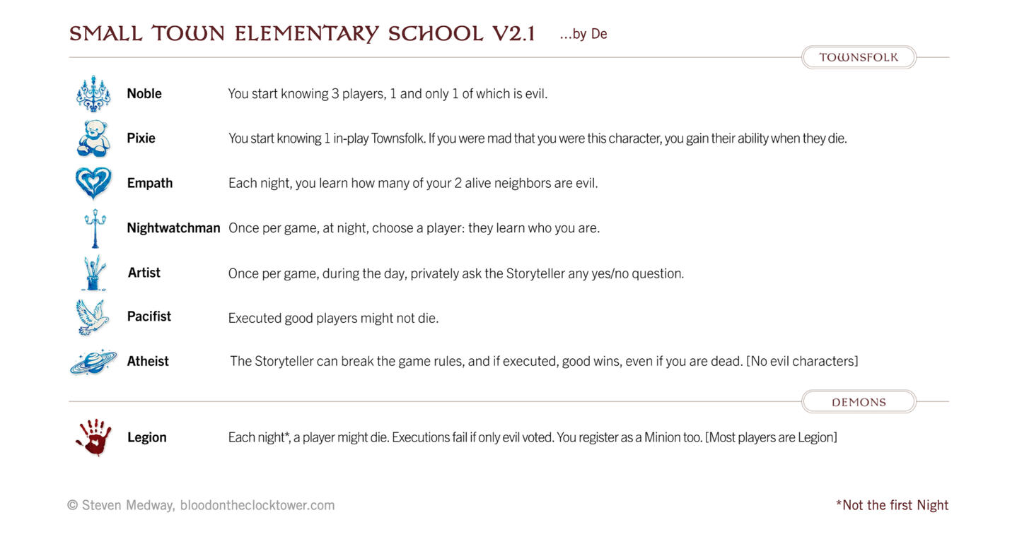 Notes: A short and sweet childhood-themed introduction to the expert characters Legion and Atheist. The entire game is to figure out which of the two game-warping characters is in play. When Legion is in play, there are exactly two good players. When only one good player lives, Legion wins. The Noble sees themselves, a Legion, and their fellow good player. When the Atheist is in play, use your unlimited Storyteller powers to turn the class against each other with misinformation, but leave some clues so it isn’t impossible to figure out!
